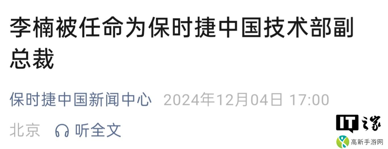 感谢本站网友 西窗旧事 的线索投递! 本站 12 月 4 日消息,保时捷中国今日宣布,增设技术部门,任命李楠为保时捷中国技术部副总裁。官方表示,作为土生土