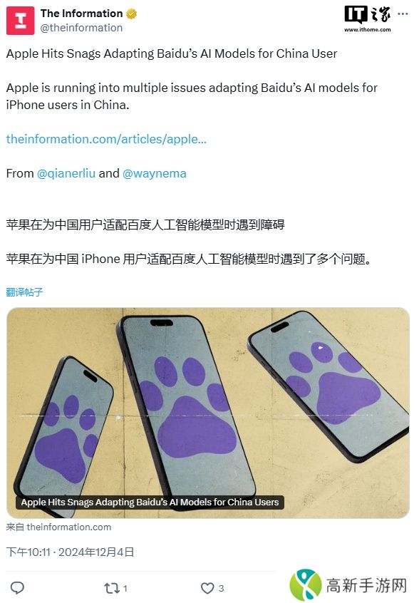 本站 12 月 4 日消息,The Information 报道称,苹果在为中国 iPhone 用户适配百度 AI 模型时遇到了困难。消息人士称,苹果和百度工程师们正改进百度大语言模型,使其更适合 i