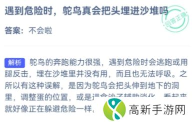 本次为大家带来的是小鸡庄园9月20日的问题答案,今天的问题关于鸵鸟,鸵鸟总被当做是逃避问题的说法,因为鸵鸟在遇到危险的时候会把头埋进沙滩里,但其实并不会哦。小鸡庄园今天答案最新9 20遇到危险时,鸵鸟