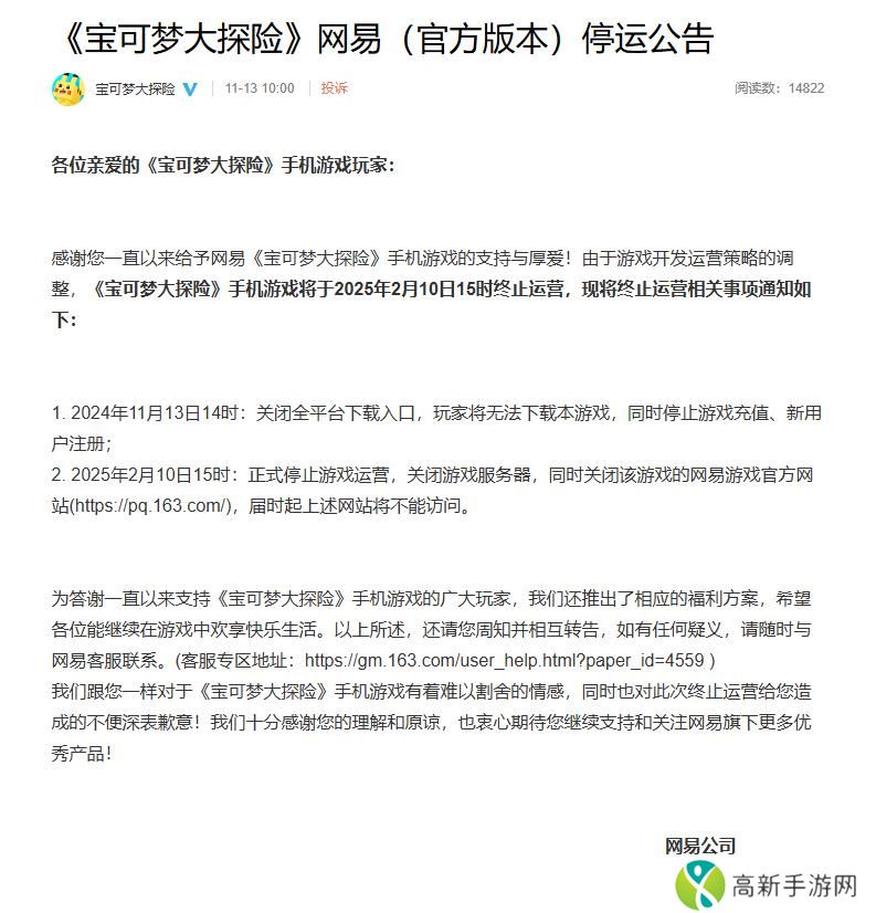 11月13日,网易《宝可梦大探险》国服发布了停运公告,宣布因为游戏开发运营策略的调整,《宝可梦大探险》国服将于2025年2月10日15时终止运营。目前游戏已经关闭了全平台下载入口,停止游戏充值和新用