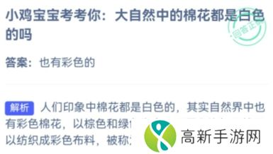 小鸡庄园今天(9月19日)的问题关于棉花,大自然中的棉花都是白色的吗?棉花是生活中不可或缺的一种作物,有不少东西都是使用棉花加工而成的,棉花本身也是一种填充材质,比如抱枕芯,另外医院也会用棉花蘸取酒精