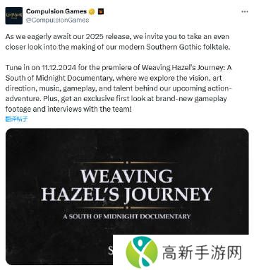 第三人称动作冒险游戏《午夜之南(South of Midnight)》开发商 Compulsion Games 昨日宣布,将于11月12日公开本作的最新预告,官方将在视频中介绍游戏开发幕后的美术、