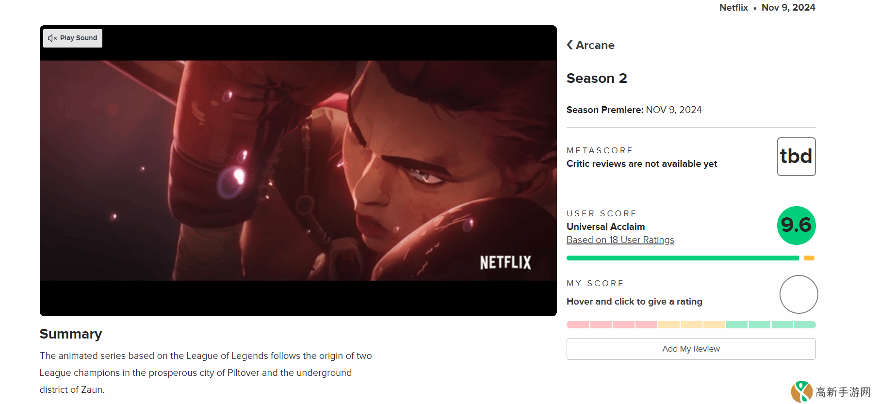 《英雄联盟》世界观衍生动画剧集《双城之战》第二季现已正式开播,腾讯视频和B站同步上线。截止至发稿时,本片在Metacritic评分网站上的观众评分高达9 6分。 目前网站共收录了19条评价,仅有