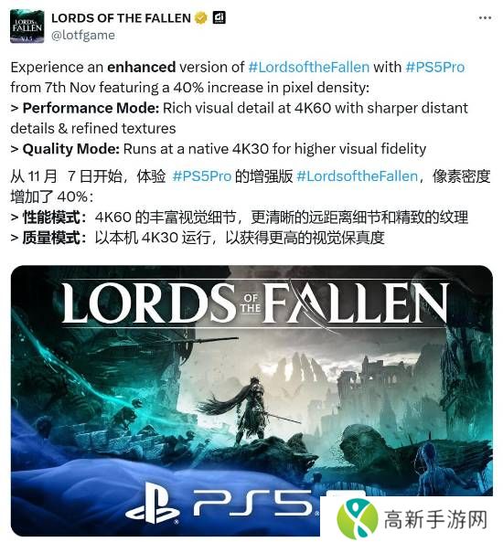 今日,类魂游戏《堕落之主》官方宣布,本作将在11月7日PS5 Pro首发当天支持增强,同时官方还分享了增强版的细节。据介绍,PS5 Pro版《堕落之主》像素密度比PS5版高出40%。在性能模式下:游