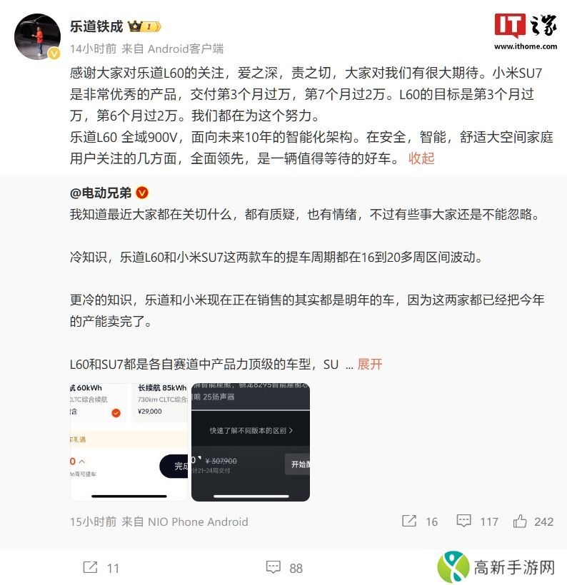 本站 10 月 30 日消息,蔚来汽车旗下乐道汽车总裁艾铁成昨天发文透露,乐道 L60 的目标是交付第 3 个月过万,第 7 个月过 2 万。他同时提到,小米 SU7 是非常优秀的产品,交付第 3 个