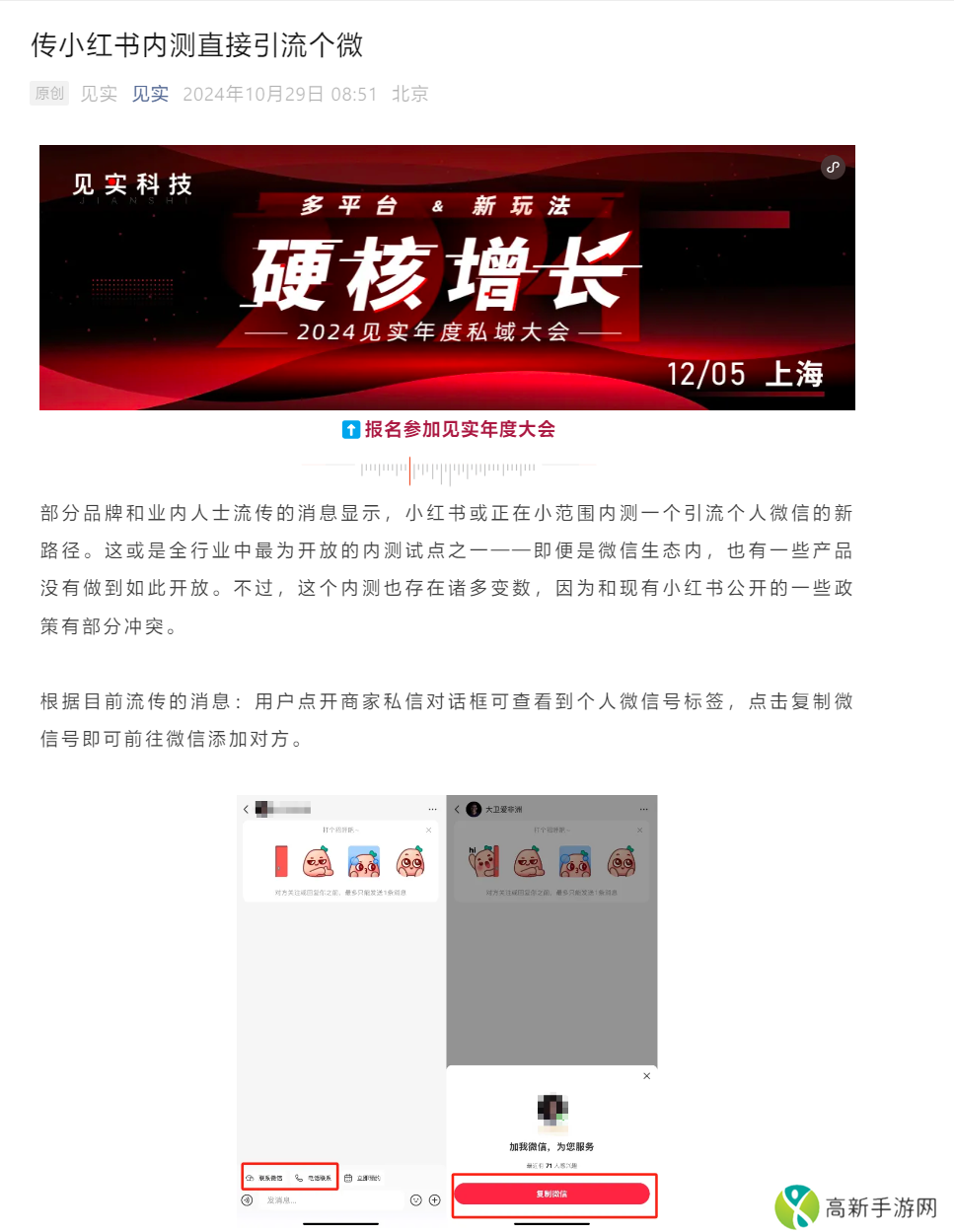 本站 10 月 30 日消息,据“见实”29 日援引部分品牌和业内人士消息称,小红书或正在小范围内测一个引流个人微信的新路径,有望成为全行业中最为开放的内测试点之一 —— 即使是微信生态内,也有一些产