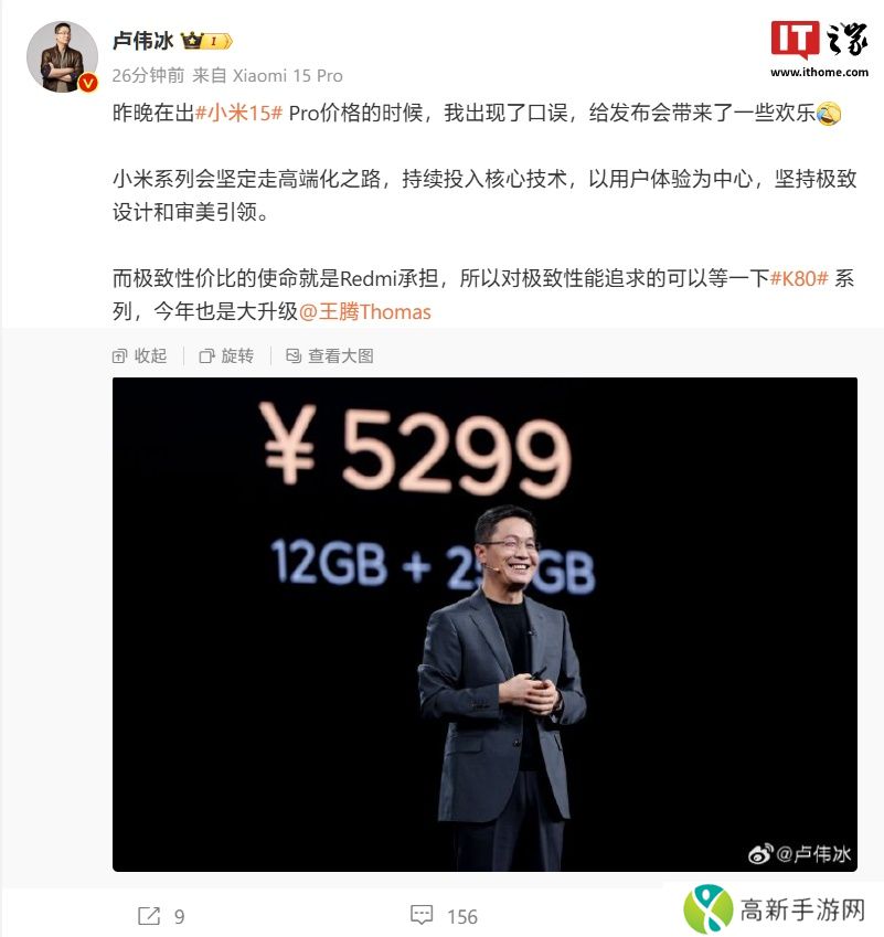 感谢本站网友 偏科骚黄4100只眼 的线索投递! 本站 10 月 30 日消息,今天上午,小米集团合伙人、总裁、手机部总裁卢伟冰在微博上发文称:“昨晚在出