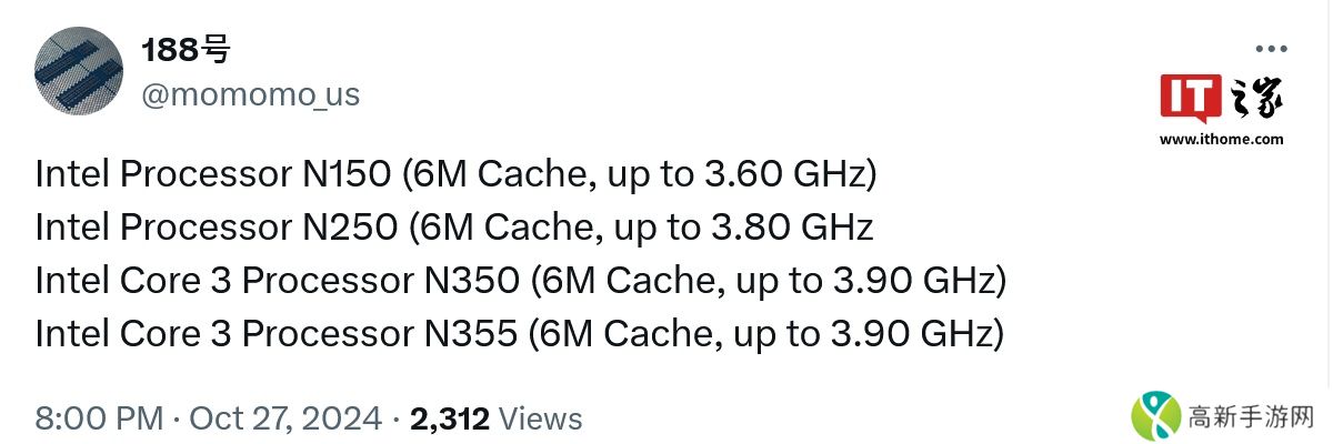 本站 10 月 30 日消息,X 平台消息人士 188号 (@momomo_us) 本月 27 日表示,英特尔即将推出 4 款 N 系列全能效核处理器。本站从外媒 FanlessTech 处获悉,这四