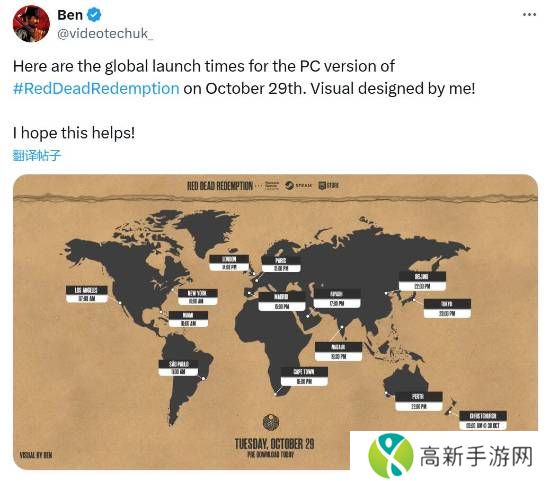 《荒野大镖客:救赎》PC版将在今日晚些时候正式发售,推主@videotechuk_自制了一张全球解锁时间图,本作在Steam国区将于北京时间晚上10点正式解锁。游戏支持简体中文界面、字幕,售价249