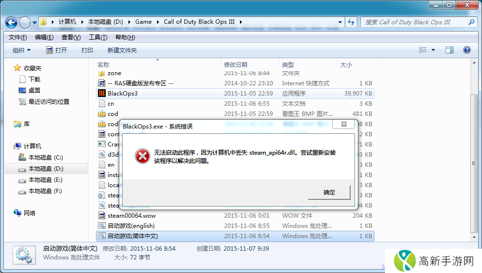 使命召唤12:黑色行动3 解决缺少steam_api64 dll方法 有玩家打了《使命召唤12:黑色行动3》2号升级补丁后运行提示缺少文件steam_api64 dll,下面就为大家带来解决缺少文件s