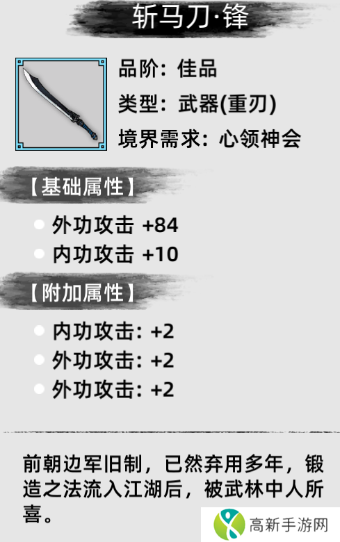 重剑无锋,大巧不工在大部分玩家游玩了新手村之后,经常手上没有趁手的武器,需要在野外去看运气掉落,但在主线流程会获得一把需要境界【心领神会】的蓝色品质重刃,并且大开大合的攻击,让攻击手段不用执着于连击数