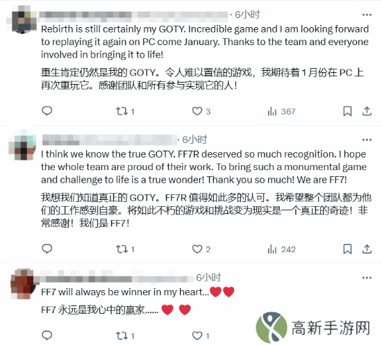 在评论区里,玩家们也对官方进行了称赞,说道:“为大家感到骄傲!祝贺大家的辛勤工作,你们值得每一份赞誉!”“《最终幻想7:重生》仍然是我的心目里的年度最佳,它是一款非常棒的游戏,我期待着能在明年1月份通过PC平台再次玩到它,感谢团队和所有参与制作这款游戏的人!”