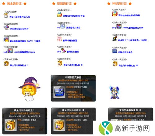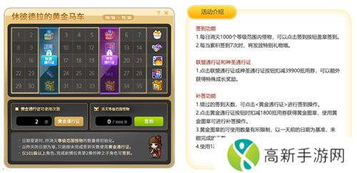 10月16日起至11月26日,打开休彼德拉的黄金马车,每天消灭1000个等级范围内怪物,即可累积签到并盖章,获得超多礼物哦~