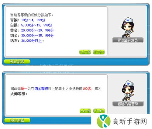 v211版本起,冒险岛成就排名系统上线,全新分级系统一目了然,炫酷的成就等级徽章技能等你来体验。根据成就难度分为普通/B级/A级/S级/SS级,成就难度越高,完成后获得的分数也越高。当成就分数达到一定水平后,成就等级随之提高,每周一会在钻石等级的勇士之中选拔前100名,成为大师等级。