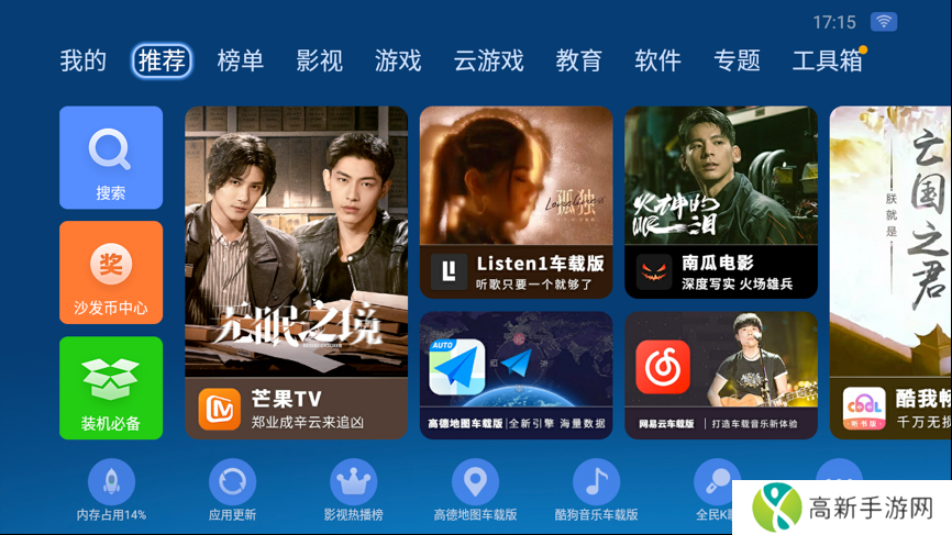 安装完成后打开沙发管家车载版应用市场,想下载什么软件直接搜索即可~也可以根据榜单来下载一些热门应用,比如腾讯视频、爱奇艺、抖音、快手、酷狗、网易云、QQ音乐、懒人听书等。