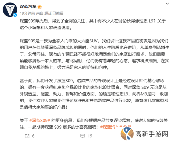 面对这样的舆论风波,深蓝汽车并未选择沉默。在官方微博上,深蓝汽车发表了一篇博文,对公众的质疑进行了正式回应。博文表示,深蓝S09自曝光以来,就受到了全网的广泛关注,其中不乏关于其外观与理想L9相似的讨论。对此,深蓝汽车表示,S09是一款专为全家人设计的大六座SUV,旨在满足用户随着家庭成长而不断变化的出行需求。