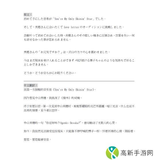 “第一次见到中山美穗,被她耀眼的光芒震撼……我依然无法接受这份现实,只能像不停呼喊的博子一样,怀着祈祷的心情,期盼着。愿您能安息。”
