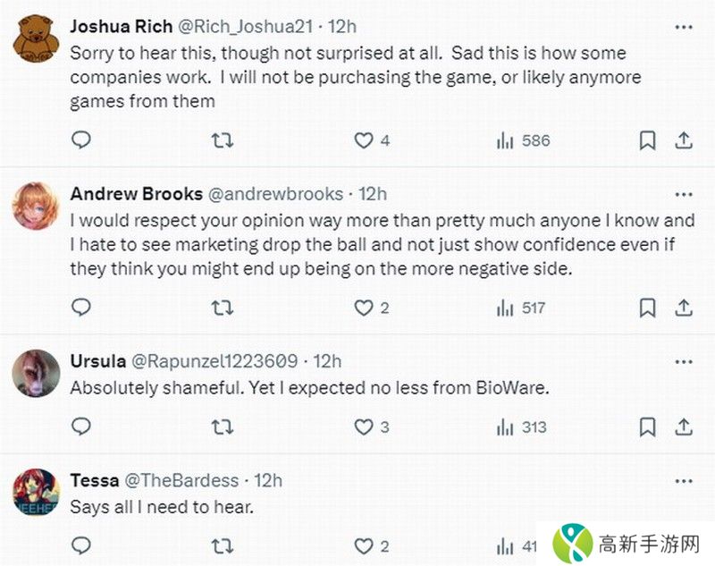 评论区有玩家表示:“Bioware太小气、太不专业了,这说明他们的游戏质量有问题!”“Bioware精心挑选评测者,任何违反规定的人都不会再收到评测码”“不是一个好兆头,总的来说很糟糕。”“DEI人士对游戏行业的掌控到了何等地步。”