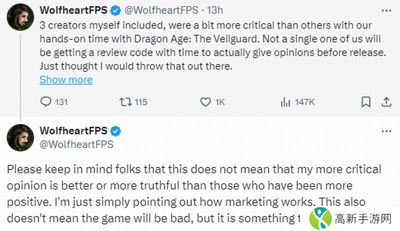 WolfheartFPS表示他和其他几位博主,只是指出了《龙腾世纪4》存在的问题,包括游戏营销在内。他们只是善意提醒下,便被取消了评测资格,真是离大谱了。