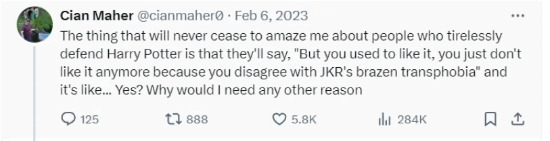 此外,他还是跨性别意识形态的坚定支持者。由于作者JK罗琳在跨性别问题上的**立场,他现在甚至不喜欢《哈利·波特》小说。