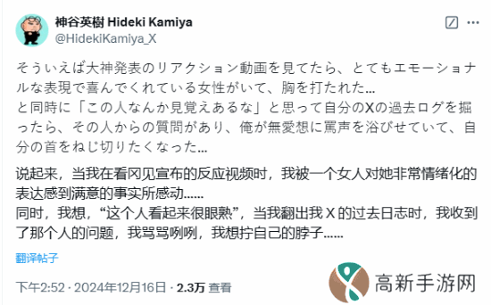 今日,神谷英树发推表示:“我观看了《大神》续作官宣时众多玩家的反应视频,其中一位女玩家非常激动且喜悦,让我十分高兴,但又发现好像在哪里见过她,直到我翻了下X的历史记录时才发现,她曾经问过我一个问题,而我却无礼地骂了她一顿,真想把自己的脖子拧掉啊。”