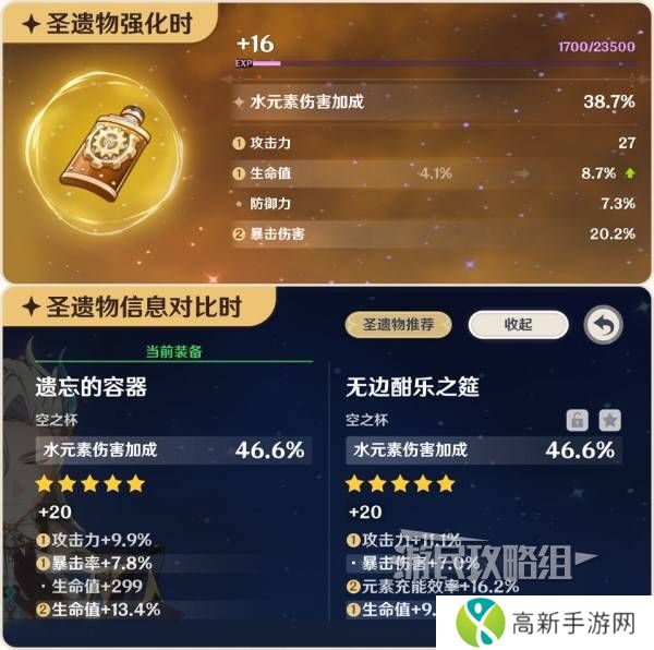 除此之外,为了进一步帮助大家节省计算成本,并快速判断圣遗物培养价值,版本更新后,强化圣遗物或使用对比查看圣遗物信息时,将能够直接了解追加属性的强化次数。推荐属性高亮配合强化次数标记,能够轻松获取角色圣遗物最优解。