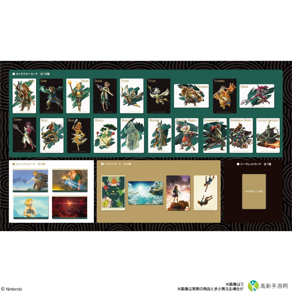 《塞尔达传说:王国之泪》的双层威化饼干中附赠卡牌游戏中各种角色的卡牌,一共有28种,全部采用金属卡纸制成,具有光泽感,并配有金色烫印、压纹加工和夜光材料等多种设计。