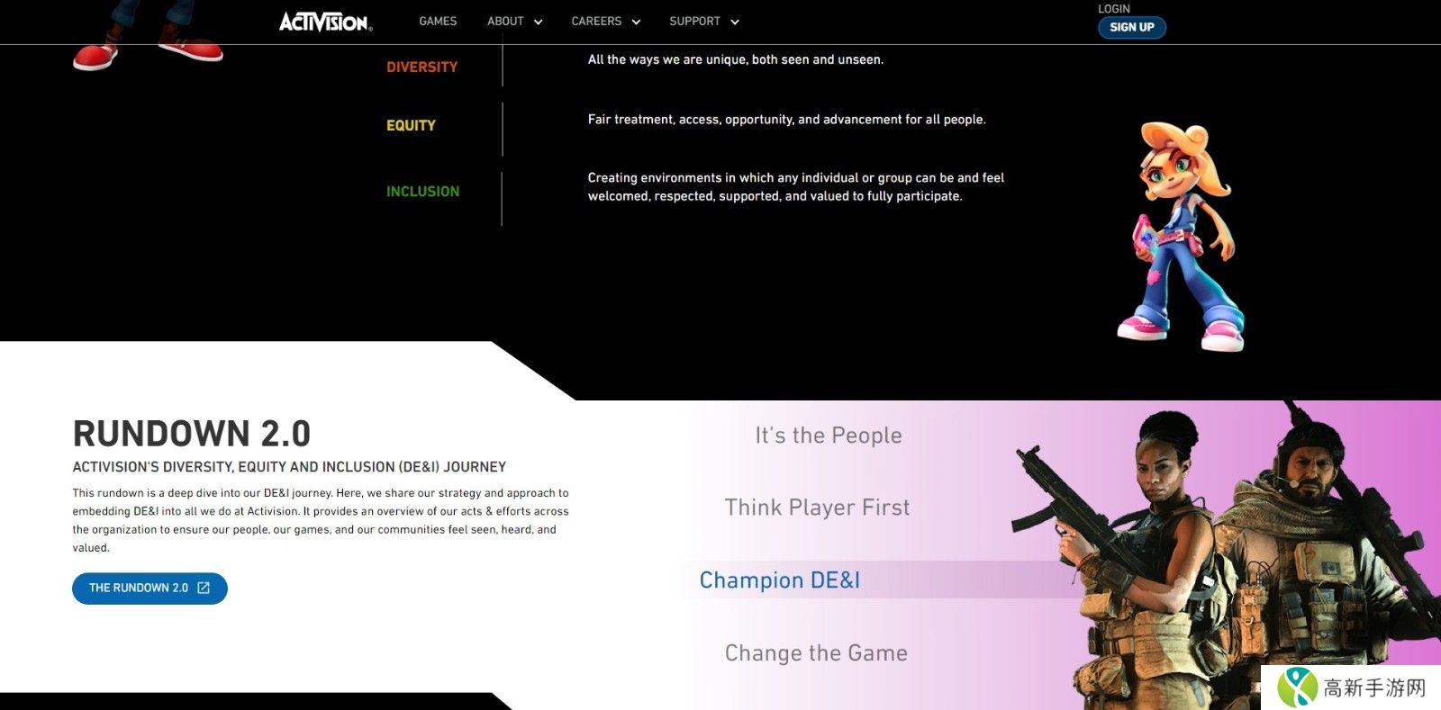 动视已更新官方网站,以表示对DEI的支持。官方甚至制定了完整的“Rundown 2.0计划”,确保今后所有项目都包含DEI。其有三个要点:员工之间的包容性、动视的游戏和多样化的受众。