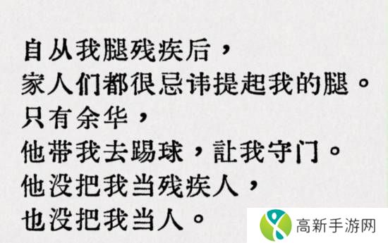 史铁生《我与地坛》里,说余华没把他当残疾人,也没把他当人,史铁生双腿瘫痪后,他们还经常带他踢足球。在辽宁文学院的一次足球比赛中,史铁生本被安排在场边做教练兼拉拉队长。然而,随着比赛的进行,失球过多,余华等人干脆让史铁生坐在轮椅里守门让辽宁的学生们再也不敢射门。