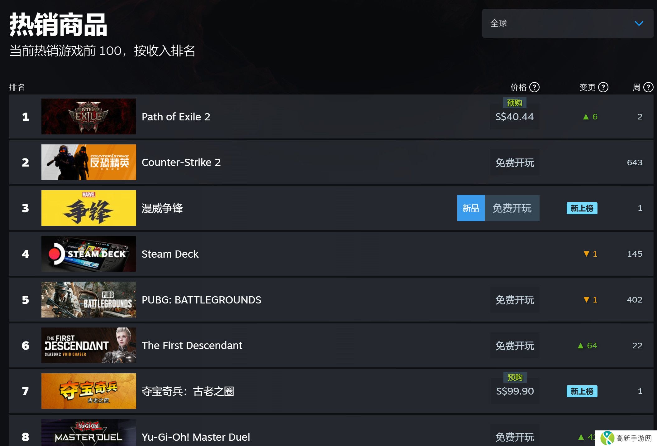 目前《流放之路2》已经超过V社免费游戏《CS2》,成为Steam全球区最畅销游戏(按照收入),本周新上线游戏《漫威争锋》和《夺宝奇兵:古老之圈》分列第三和第七名。