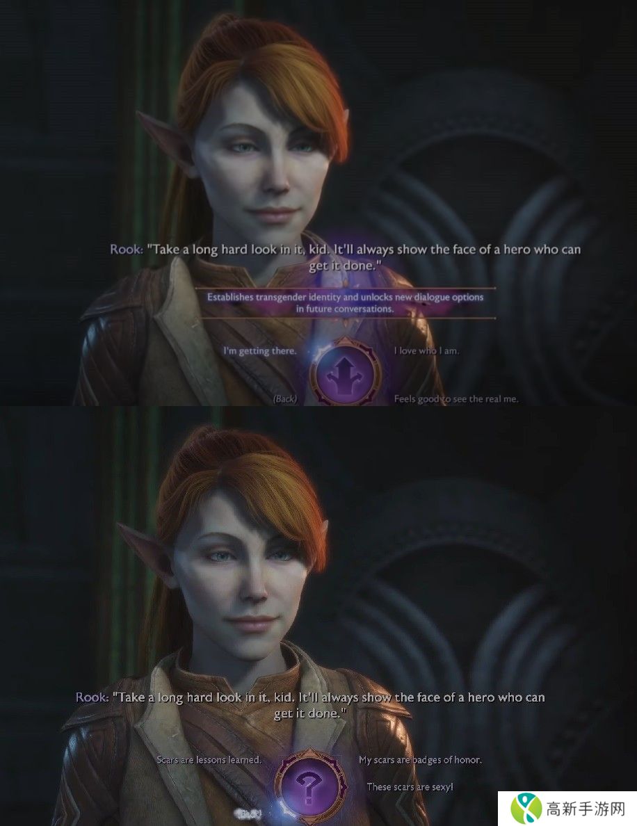 近日游戏博主Mangalawyer发现《龙腾世纪4》的对话在宣扬ZZZQ价值观:在某个对话中,系统提示玩家可通过创建跨性别角色解锁更多对话选项,有网友表示这是变性人总监在夹带私货。
