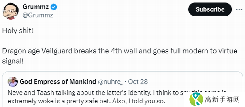 还有获得测试资格的玩家发现,《龙腾世纪4》NPC竟然也在大谈"性别认同" 。前暴雪制作人Grummz表示:“《龙腾世纪4》打破了第四面墙,完全以‘现代化’方式彰显了美德!”