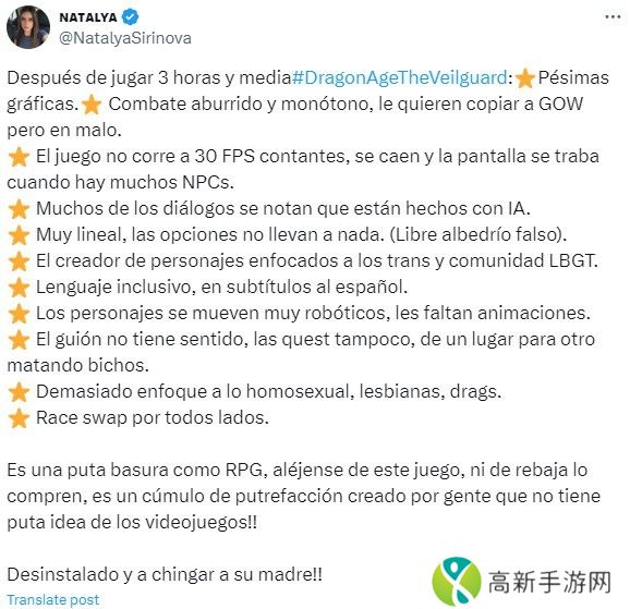 此前参与了《龙腾世纪4》测试的美女博主Natalya Sirinova表示:“《龙腾世纪4》画面糟糕,战斗无聊单调。游戏充满Bug,出现大量NPC时游戏会崩溃。剧情线性,玩家选择毫无意义。游戏过于ZZZQ,对同性恋的关注过多。这就是一款*游戏,奉劝大家别买,打折也别买!”