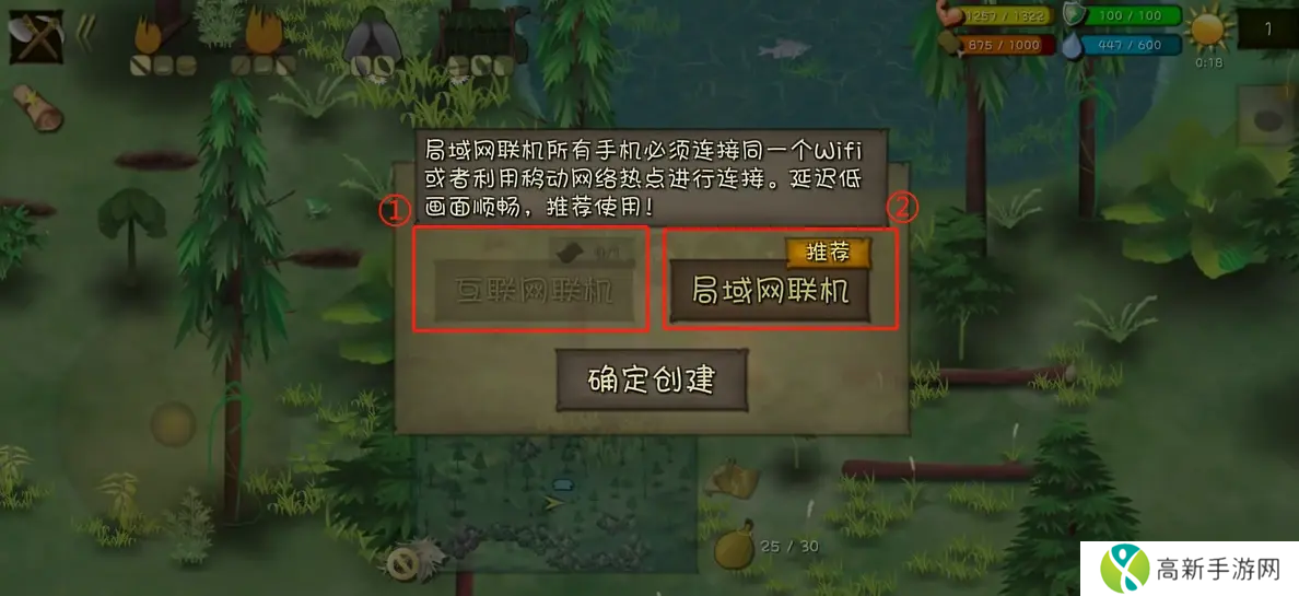 进入游戏后,挨饿德只需要生起一堆篝火,靠近并点击求助图标,便可开启房间,联机模式有两种选择,一种是局域网联机,一种是互联网联机。