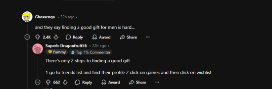 对此,许多网友纷纷调侃:“谁说给男生挑礼物难?只需要查看他的愿望清单,然后购买即可。”还有玩家开玩笑道:“请问你老婆现在是单身吗?”