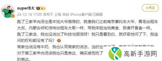 B太称:“跑了本地大爷推荐的三家羊肉汤,我也没说加了科技与狠活呀!我只是看到白,就好奇地问了下,我连问的权利都没有了吗?”