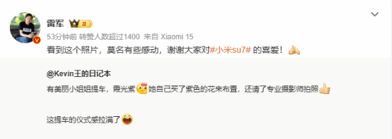 日前,博主@Kevin王的日记本分享了一位女士提车霞光紫配色小米SU7的动态获得了雷军本人的关注,他回复道:“看到这个照片,莫名有些感动,谢谢大家对小米su7的喜爱!”