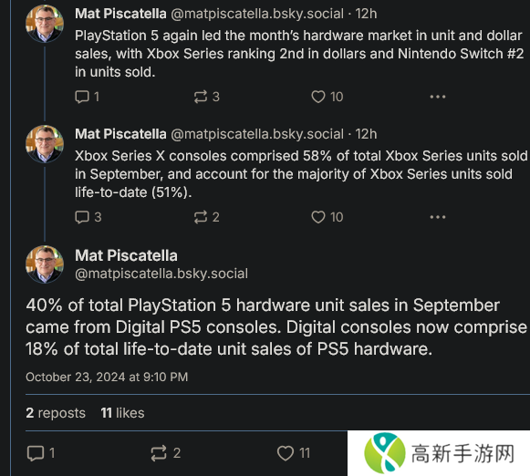 Circana 分析师 Mat Piscatella 分享的主要是美国市场 2024 年 9 月的销售数据。就仅该月而言,PS5 数字版销量占主机总销量的 40%。