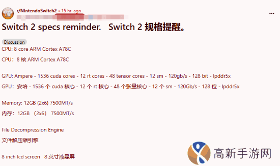 有玩家日前再次在Reddit论坛里晒出了一份疑似为Switch 2的硬件规格内容,内容显示,Switch 2的CPU为8核ARM Cortex A78C,GPU为Ampere架构、1536个CUDA核心、12个RT核心、48个Tensor核心、12个SM单元、120GB/s带宽、128位宽、LPDDR5X显存,内存为12GB (2x6) 7500MT/s,并带有8英寸的LCD屏。