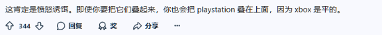 此外还有人表示,你这图片单纯是为了惹人生气,对吗?就算是把他们叠在一起,也得是Xbox one在下面,因为PS5的外壳是有弧度的,根本放不稳!