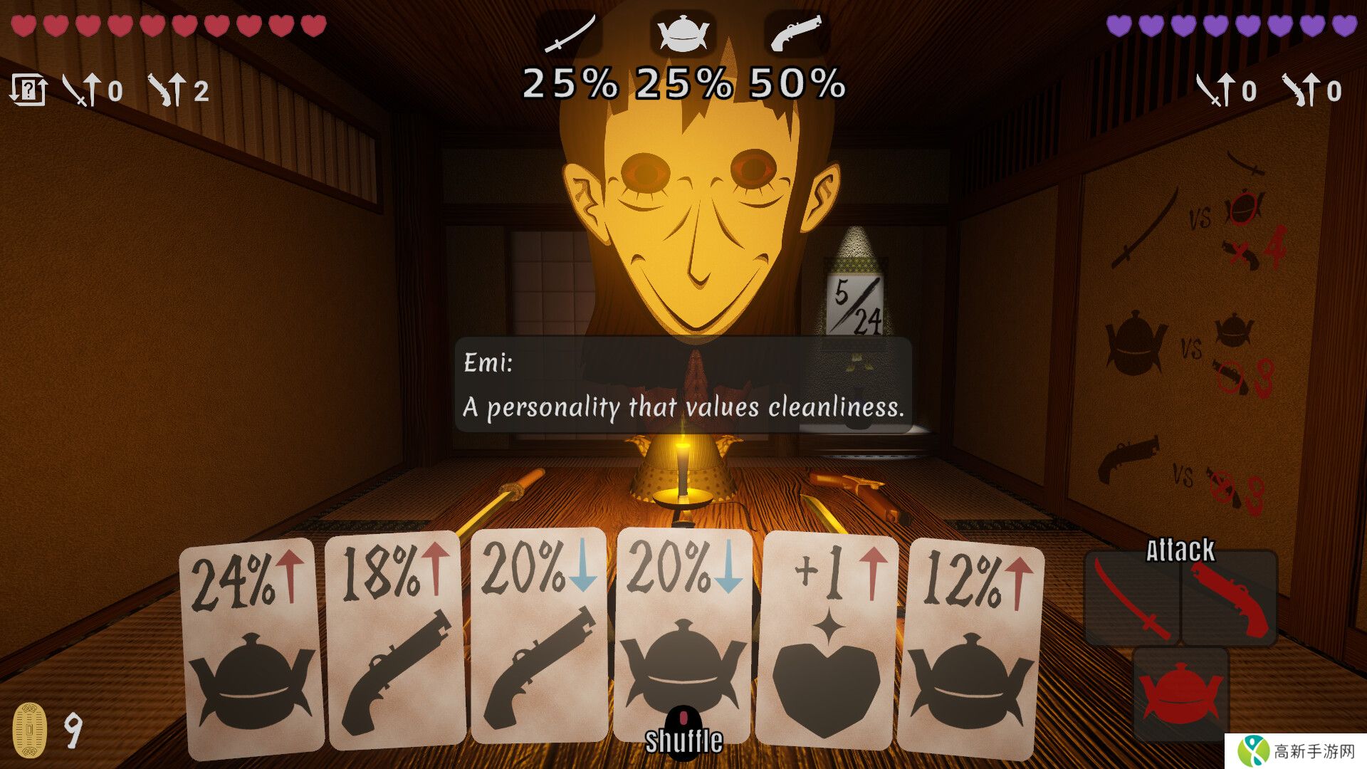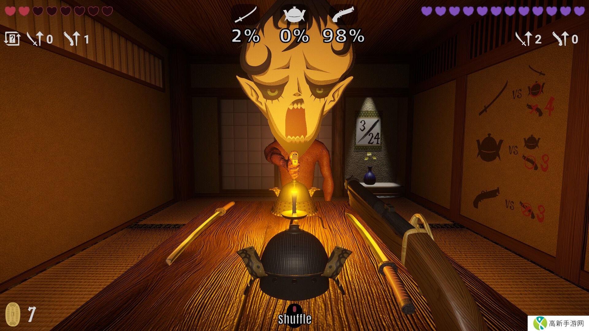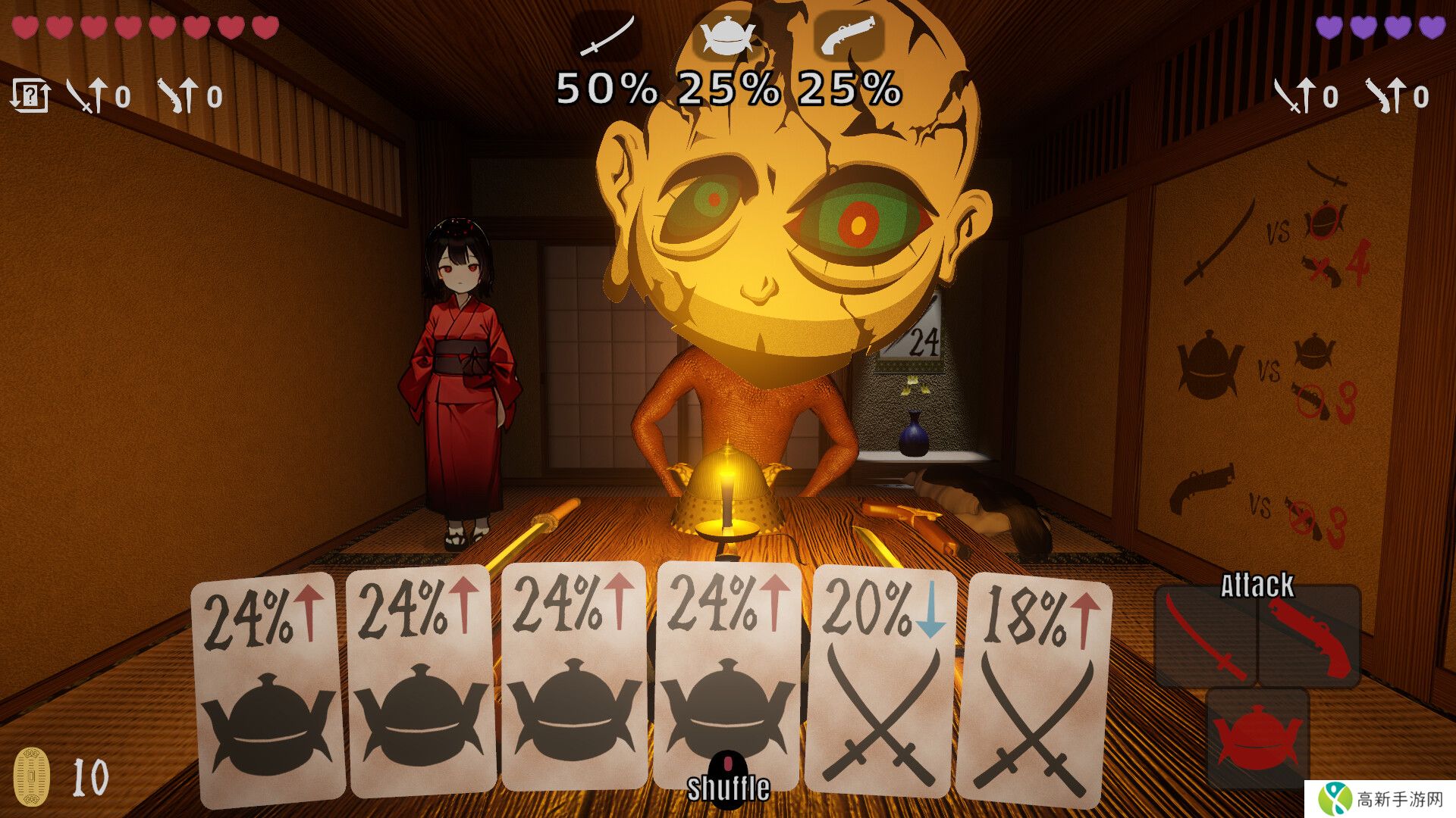 本作是一款只需用鼠标即可游玩的休闲回合制策略恐怖游戏。武士刀克火绳枪。兜甲克武士刀。火绳枪克兜甲。怪物的行动通过卡牌来控制。祝你好运,逃出“J-Room”。