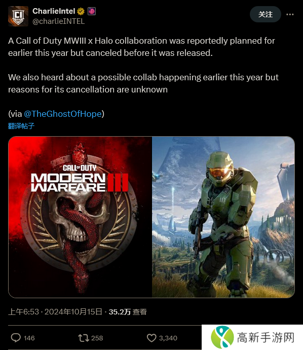 他写道:“《光环》与《使命召唤》士官长联动包居然因为完全位置的原因被取消了。”