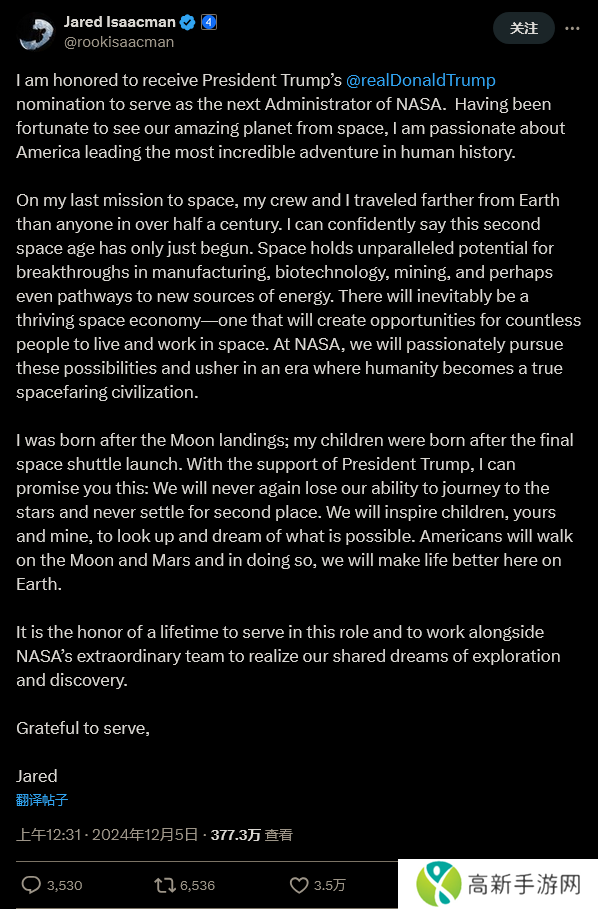 在SpaceX 老板埃隆·马斯克运营的社交媒体 X/推特上,艾萨克曼感谢了特朗普总统的任命,并写道:“在特朗普总统的支持下,我可以向人们保证,我们将永远不会再失去飞向星空的能力,也永远不会屈居第二。美国人将在月球和火星上行走,并且我们会以此让地球上的生活变得更加美好。”