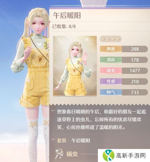 获得这个套装需要通过制作,制作需要先找到套装设计图,通过在《无限暖暖 Infinity Nikki》中见到诺诺伊撞上花愿镇最显眼的服装店的屋顶后,获得制作“午后暖阳”套装的设计图。你需要找到一只美味蜜蜂来修复损坏,而修复工作只能通过穿戴捕虫服装来完成。