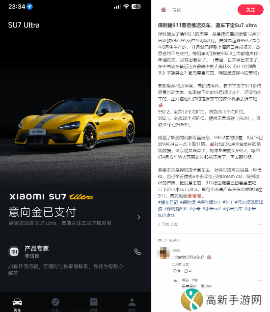 快科技12月9日消息,近日有网友在小红书发帖称,自己遭遇保时捷恶意推迟交车,气愤之余他直接退单,并转头下定了小米SU7 Ultra。