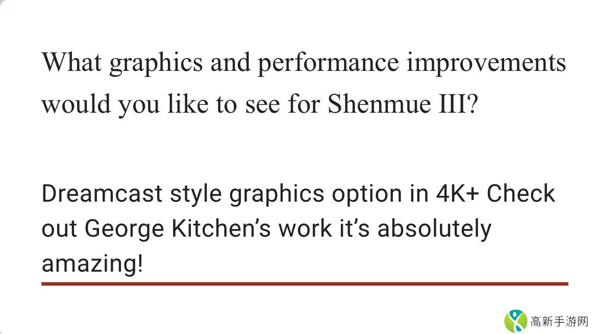 此外还问到玩家期待《莎木3》将获得什么样的画质和性能改进,比如Dreamecast风格的画面(4K)。