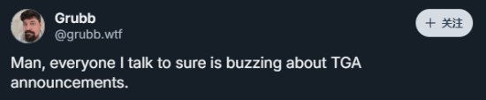 而最近,知名舅舅党Jeff Grubb也表达了类似的看法。他表示:“与我交谈的每个熟人都在谈论TGA的公告。”尽管具体内容尚未泄露,但看得出来很多业内人士都在尽力隐藏即将公布的内容,而这些内容似乎相当重磅以至于舅舅党们非常兴奋都有些按耐不住了。