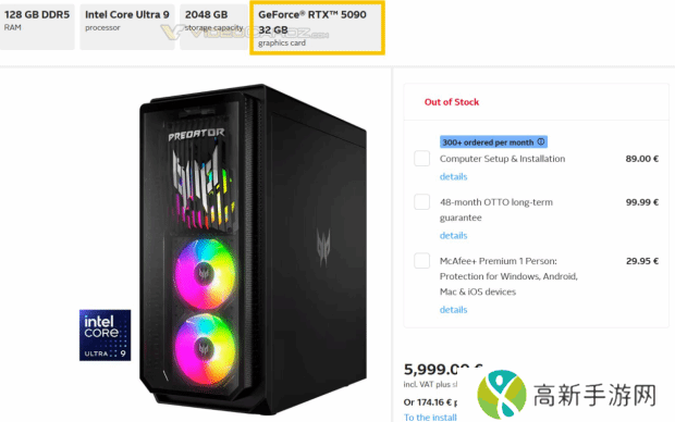 其中旗舰型号采用NVIDIA GeForce RTX 5090 32GB显卡+Intel Core Ultra 9 285K处理器的性能组合,搭配128GB DDR5内存与2T SSD,定价为5999欧元,约合人民币超过45380元。