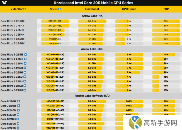 酷睿Ultra 200H系列一共5款,包括16(6P+8E+2LP)核心、24MB三级缓存的酷睿Ultra 9 285H、酷睿Ultra 7 265H/255H,14((4P+8E+2LP))核心、18MB三级缓存的酷睿Ultra 5 235H/225H,加速频率4.9-5.4GHz不等。核显除了最低端225H拥有7个单元Xe核显,其他都是8个单元。TDP除了最高端的285H是45W,其他均为28W。 酷睿Ultra 200U系列一共4款,包括酷睿Ultra 7 265U/255U、酷睿Ultra 5 235U/225U,这4款都是12(2P+8E+2LP)核心、12MB三级缓存、4单元Xe核显、15W TDP,加速频率4.8-5.3GHz不等。