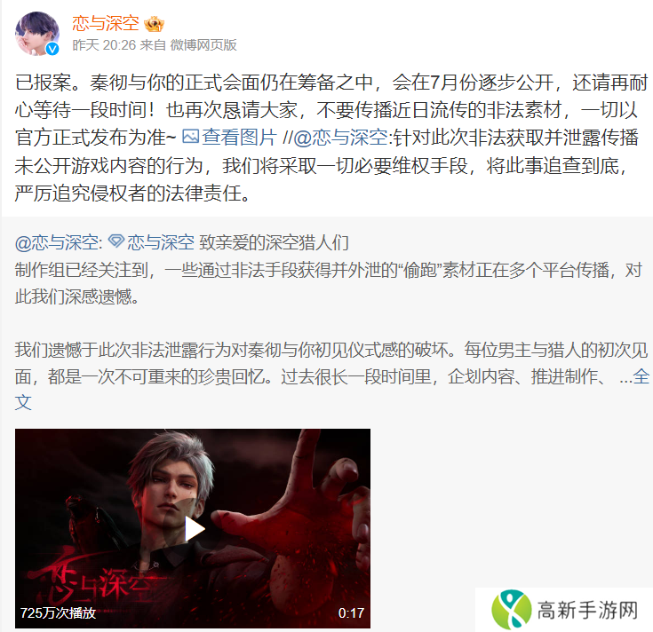 由于此次事态较为严重,叠纸官方紧急发布了秦彻的PV,与原定的7月时间提前了许多。发布PV后,官方更表示会采取维权手段追查到底,且已报案给警方。